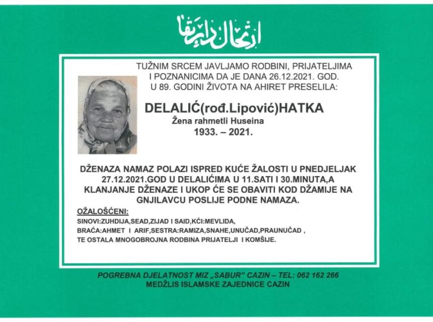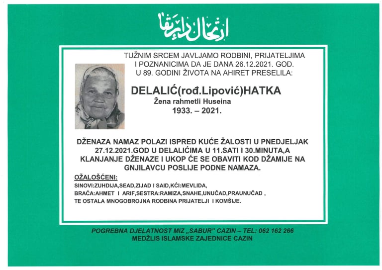 Tužnog srca i s bolom u duši obavještavamo rodbinu, komšije i prijatelje da je naša draga Delalić (rođ. Lipović) Hatka, dana 26.12.2021. godine, u 89-oj godini života, preselila na Ahiret.