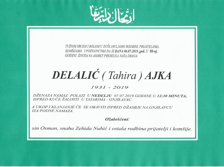 Tužnim srcem javljamo rodbini, prijateljima, komšijama i poznanicima da je dana 06.07.2019.godine u 88. godini života na Ahiret preselila Delalić (Tahira) Ajka.