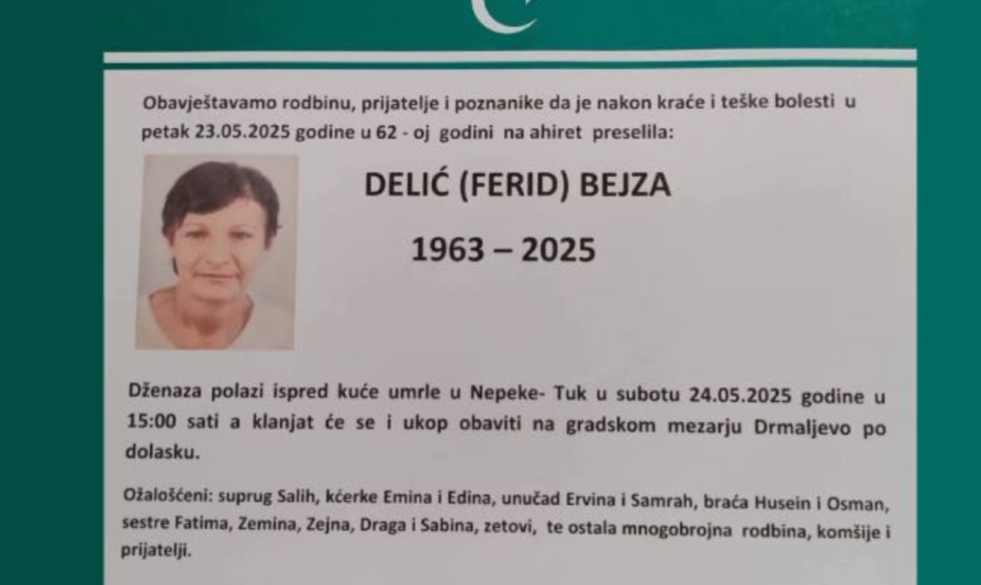 Obavještavamo rodbinu i prijatelje da je 23. maja nakon kraće i teške bolesti na Ahiret u 62. godini života preselila Delić (Ferida) Bejza