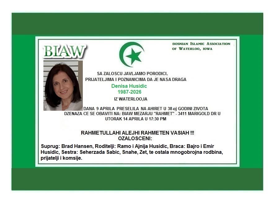 Dženaza će se obaviti na BIAW mezarju „Rahmet“, 3411 Marigold Dr, u utorak, 14. aprila u 17:30 sati.