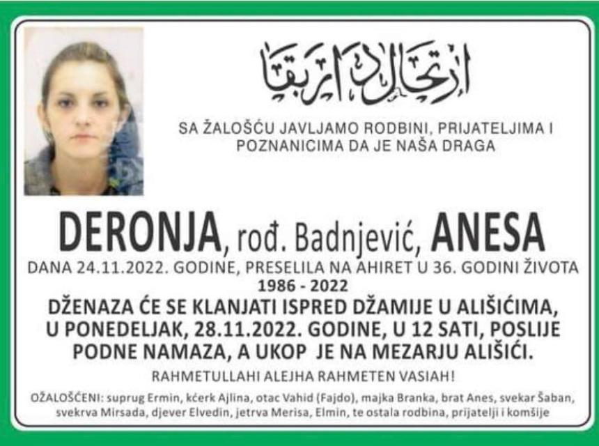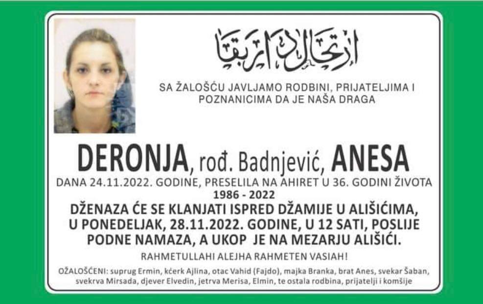 Javljamo rodbini, prijateljima i poznanicima da je Deronja (rođ. Badnjević) Anesa preselila na Ahiret u 36. godini života.