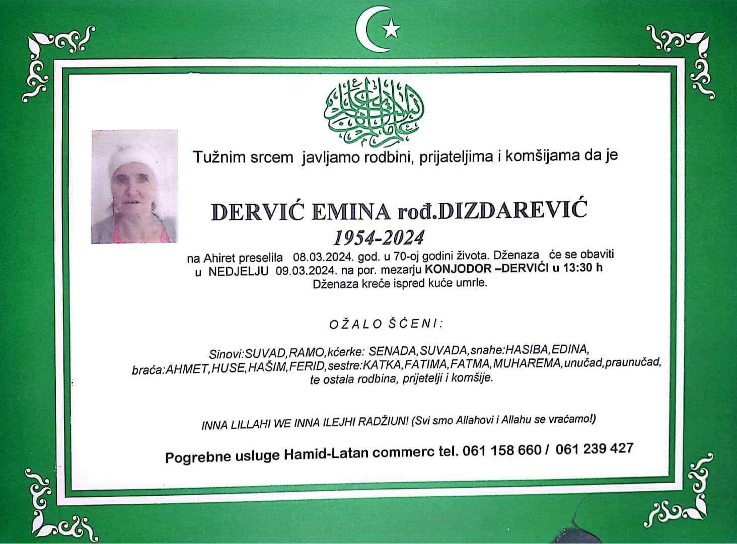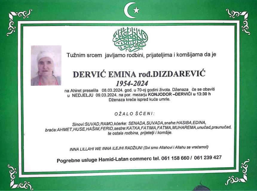 Tužnim srcem javljamo rodbini, prijateljima, komšijama i poznanicima žalosnu vijest da nam je naša draga Dervić Emina rođ. Dizdarević dana 08.03.2024. godine u 70. godini života preselila na Ahiret.