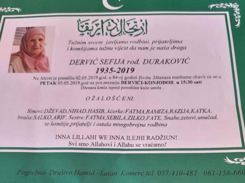 Na Ahiret je preselila 02. 05. 2019. god. u 84-oj godini života. Dženaza merhume obavit će se u petak 03. 05. 2019. god. na porodičnom mezarju Dervići- Konjodor u 15:30 sati. Dženaza kreće ispred porodične kuće umrle.