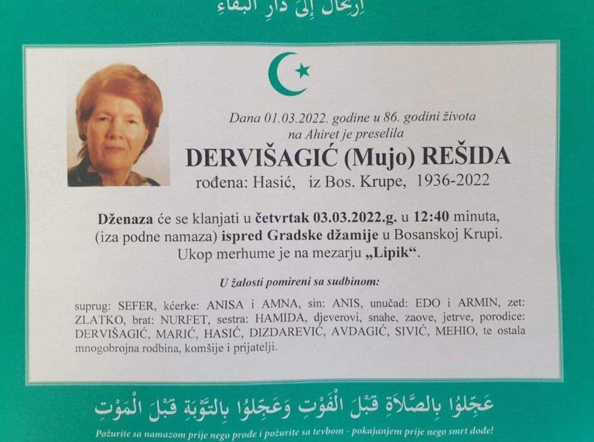 Tužnog srca i s bolom u duši obavještavamo rodbinu, komšije i prijatelje da je naša draga Dervišagić (Mujo) Rešida u 86. godini života preselila na ahiret.