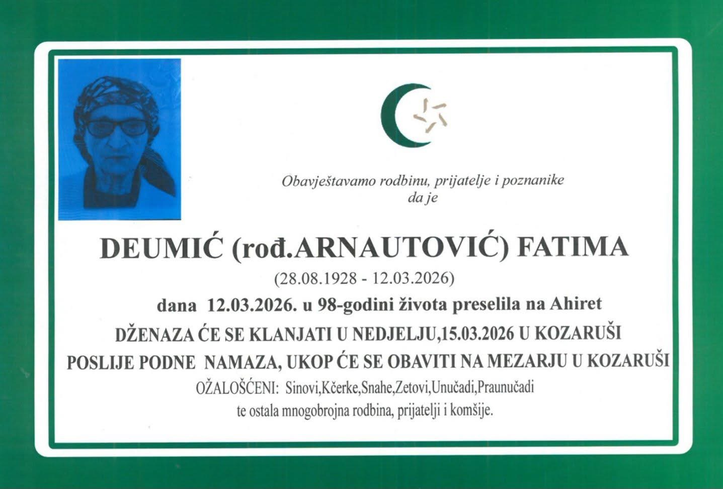 Dženaza će se klanjati u nedjelju, 15.03.2026. u Kozaruši, poslije podne namaza, a ukop će se obaviti na mezarju u Kozaruši.