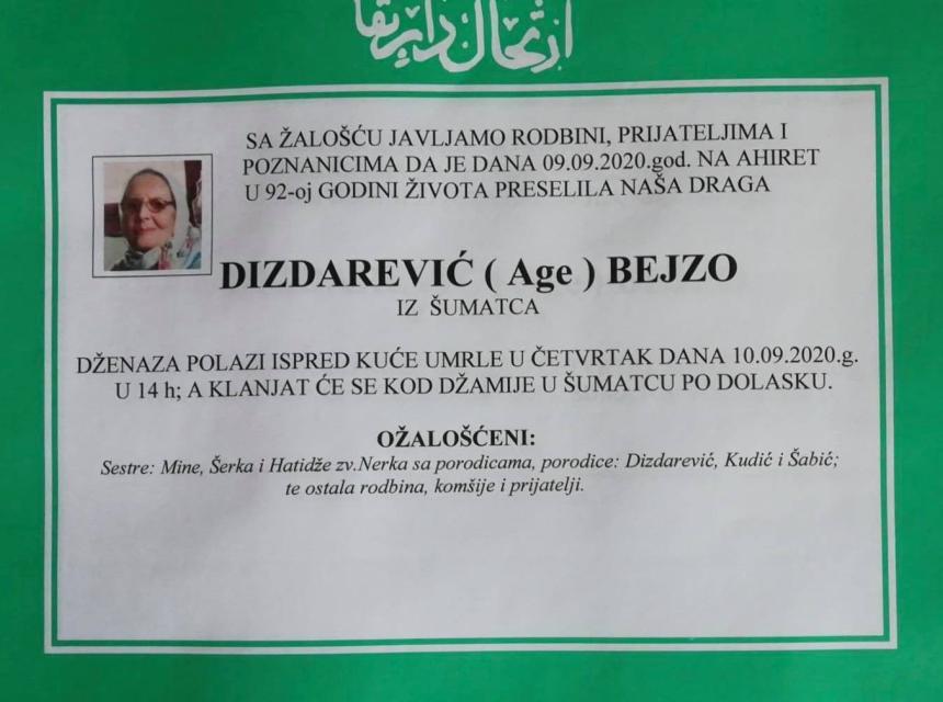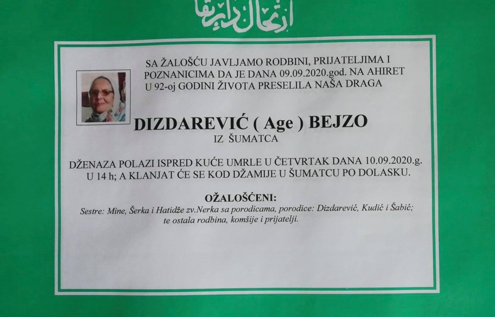 Tužnog srca i s bolom u duši obavještavamo rodbinu, komšije i prijatelje da je naša draga Dizdarević (Age) Bejzo, dana 09.09.2020. godine, u 92-oj. godini života, preselila na Ahiret.