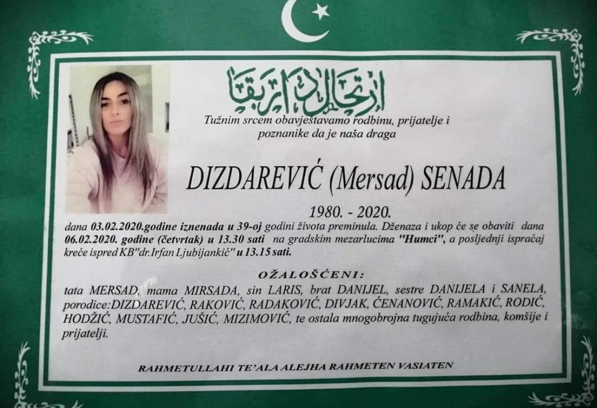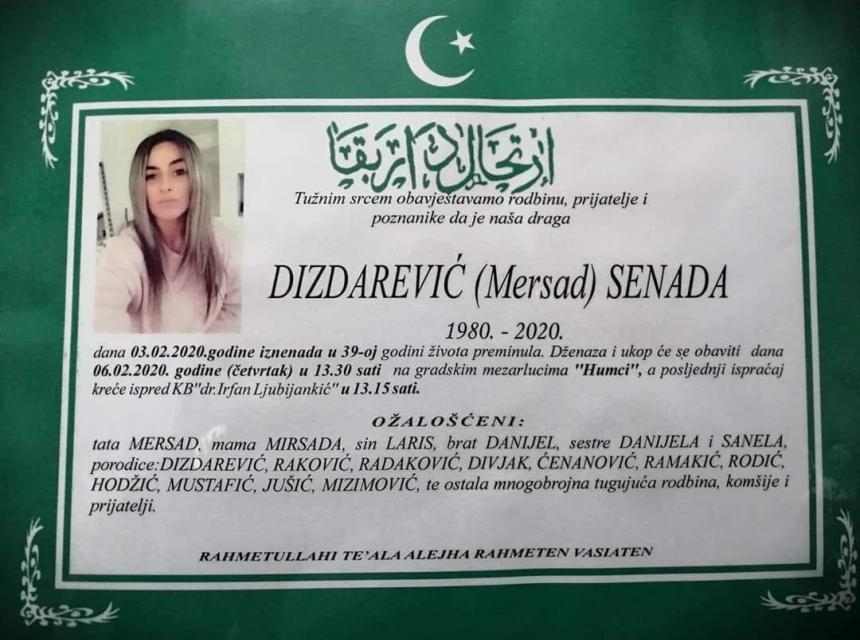 Tužnim srcem i s bolom u duši obavještavamo rodbinu, prijatelje i komšije da je naša draga Dizdarević (Mersad) Senada preselila na Ahiret dana 03.02.2020. godine u 39. godini života.
