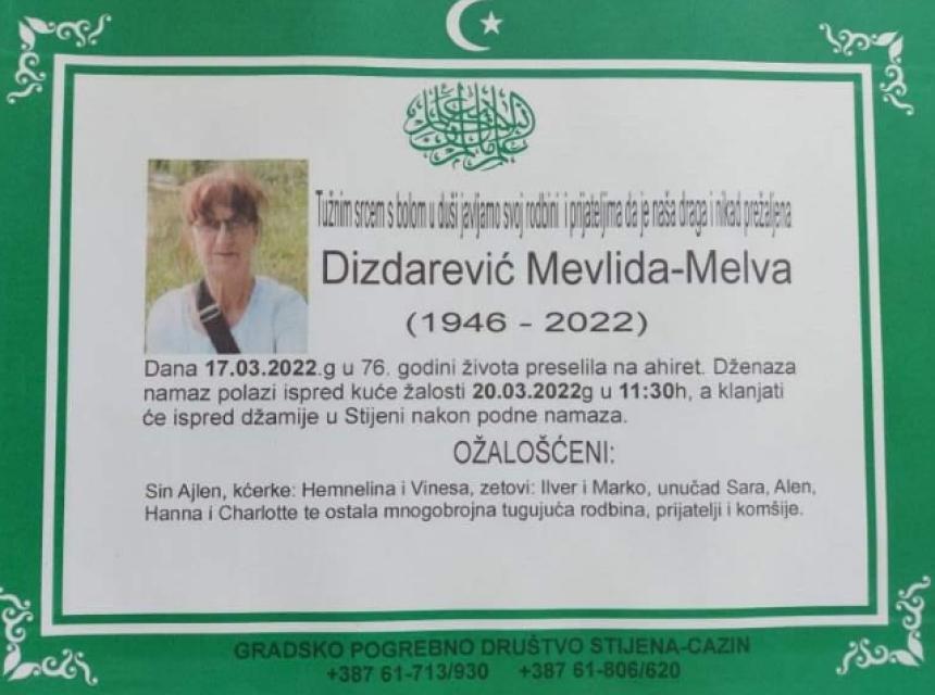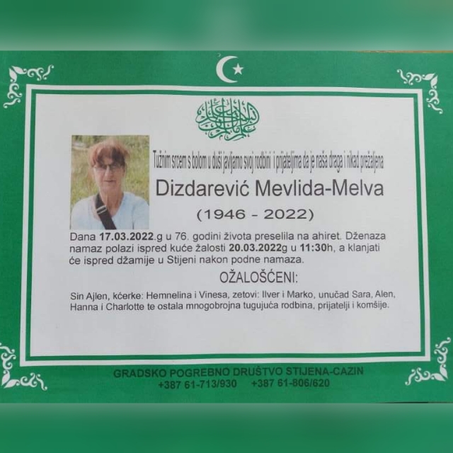 Tužnog srca i s bolom u duši obavještavamo rodbinu, komšije i prijatelje da je naša draga Dizdarević Mevlida- Melva u 76. godini života preselila na Ahiret.
