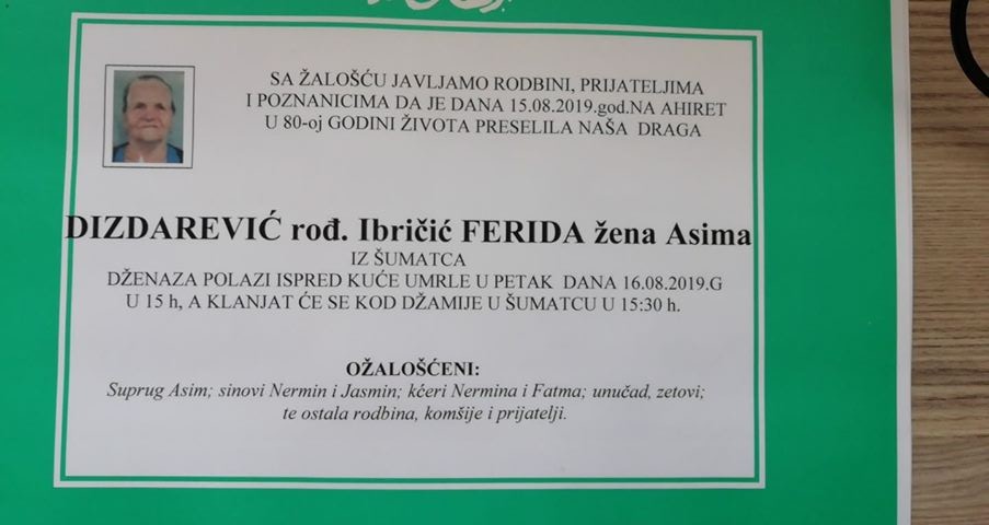 Sa žalošću javljamo rodbini, prijateljima i poznanicima da je dana 15.08.2019. god na Ahiret preselila u 80-oj godini života naša draga Dizdarević (rođ. Ibričić) Ferida, žena Asima iz Šumatca.