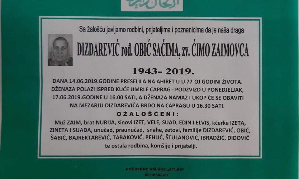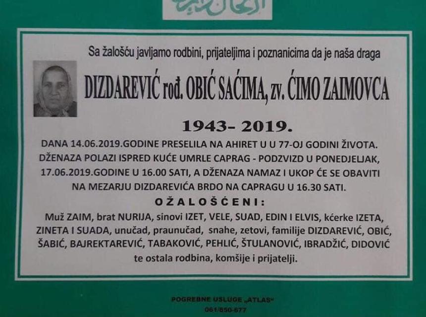 Dženaza polazi ispred kuće umrle Caprag- Podzvizd u ponedjeljak, 17. 06. 2019. godine u 16:00 sati, a dženaza namaz i ukop će se obaviti na mezarju Dizdarevića Brdo na Capragu u 16:30 minuta.