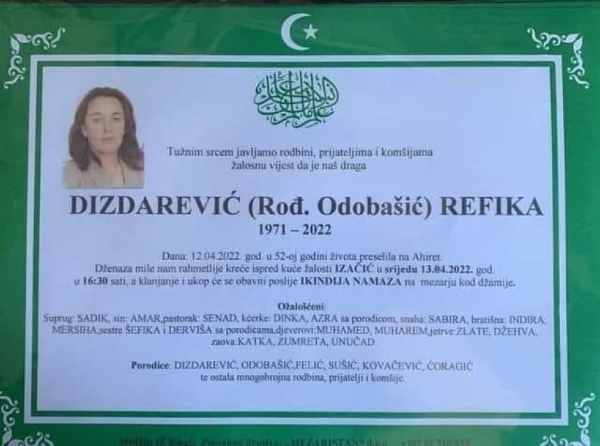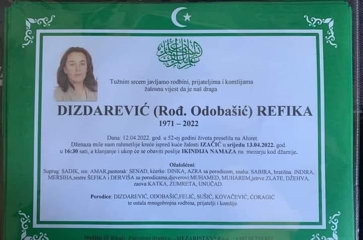 Tužnog srca i s bolom u duši obavještavamo rodbinu, komšije i prijatelje da je naša draga Dizdarević (Rođ. Odobašić) Refika, dana 12.04.2022. godine, u 52-oj godini života, preselila na Ahiret.