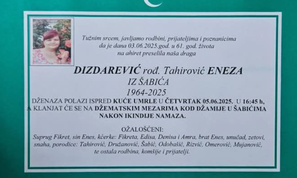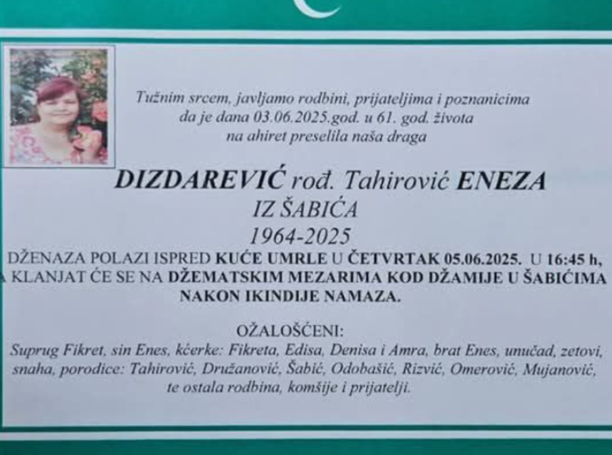 Obavještavamo rodbinu i prijatelje da je 03. juna na Ahiret u 61. godini života preselila Dizdarević (rođena Tahirović) Eneza, iz Šabića.