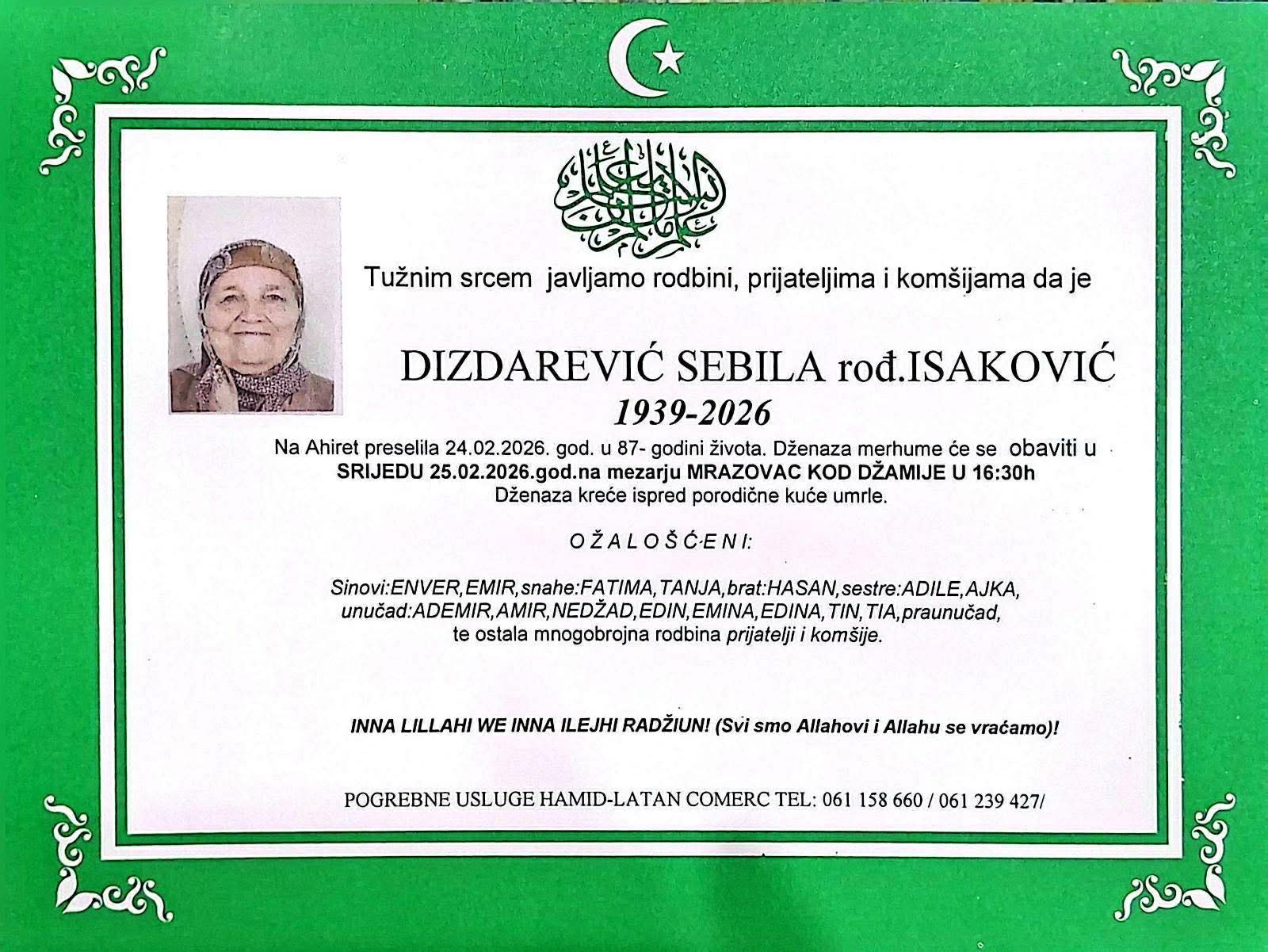 Tužnim srcem javljamo rodbini, prijateljima i komšijama da je DIZDAREVIĆ SEBILA rođ. ISAKOVIĆ na Ahiret preselila 24.02.2026. god. u 87- godini života.
