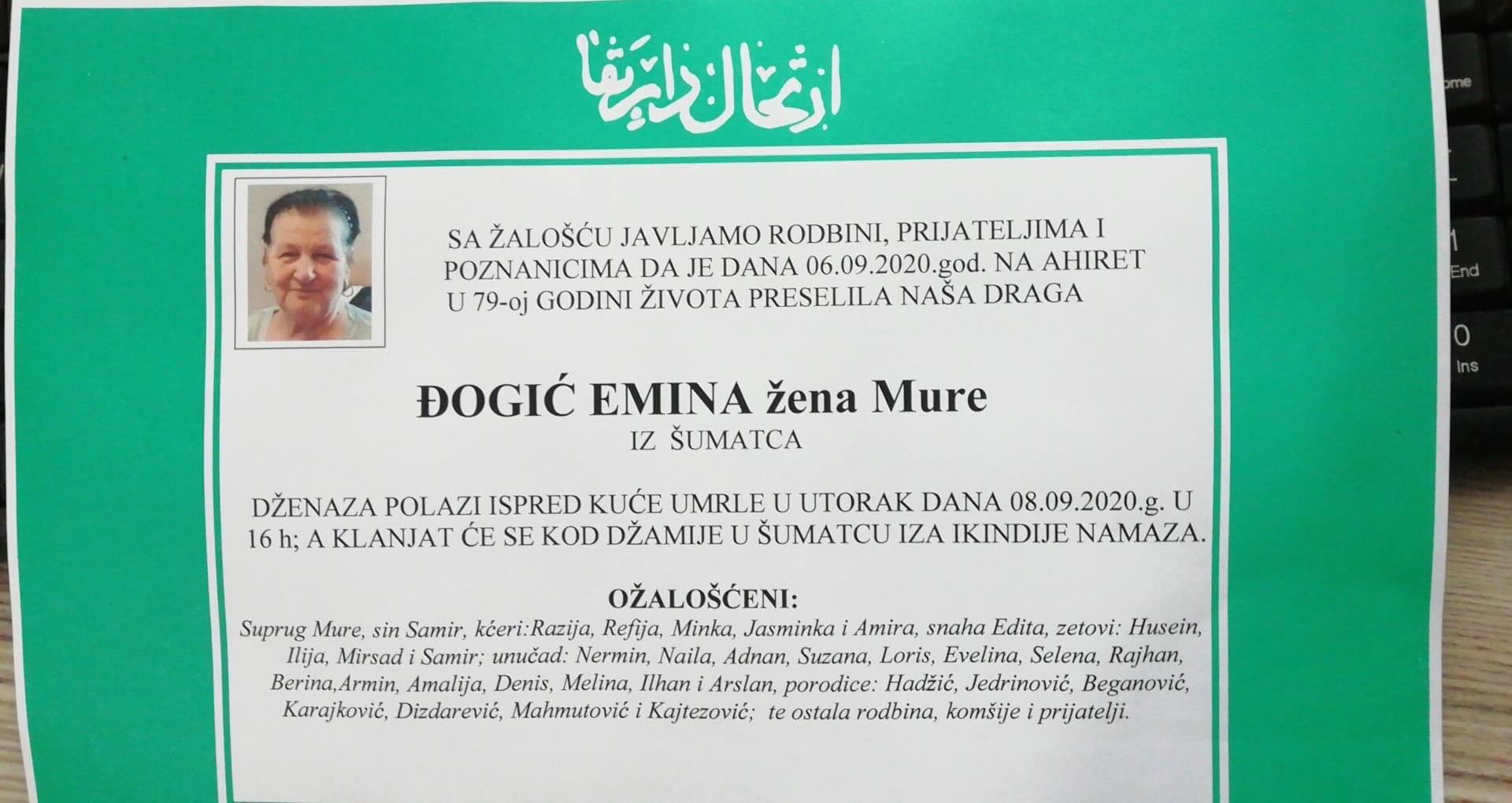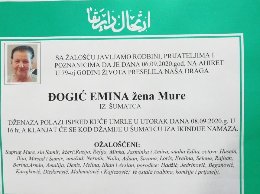 Tužnog srca i s bolom u duši obavještavamo rodbinu, komšije i prijatelje da je naša draga Đogić Emina žena Mure 6. septembra 2020. godine, u 79. godini života, preselila na Ahiret.