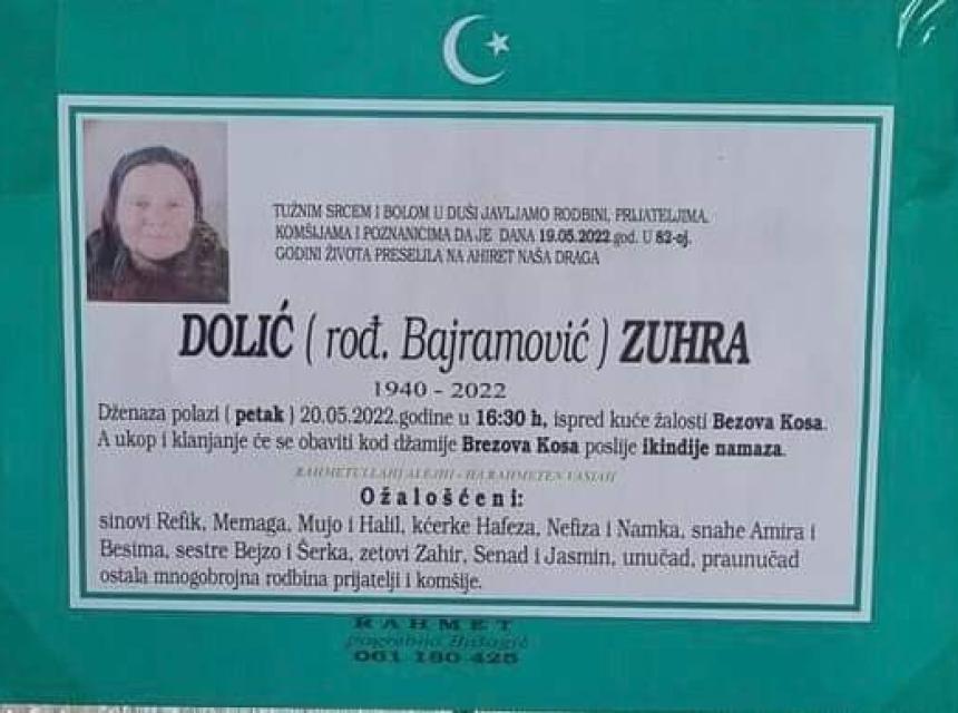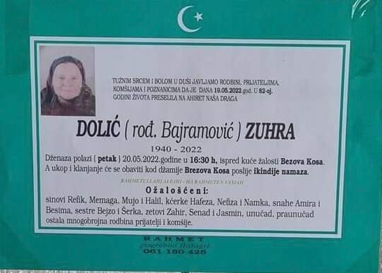 Tužnog srca i s bolom u duši obavještavamo rodbinu, komšije i prijatelje da je naša draga Dolić (Bajramović) Zuhra u 82. godini života preselila na Ahiret.