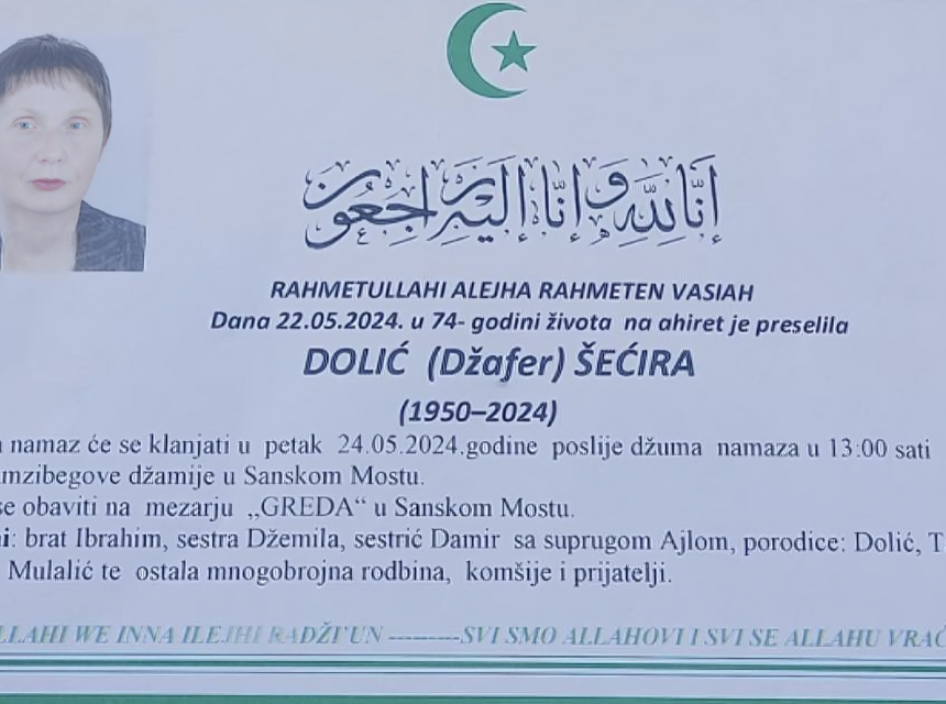 Tužnim srcem javljamo rodbini, prijateljima i komšijama da je Na Ahiret preselila Dolić (Džafer) Šećira na Ahiret preselila 22.05.2024. god. u 74-oj godini života.
