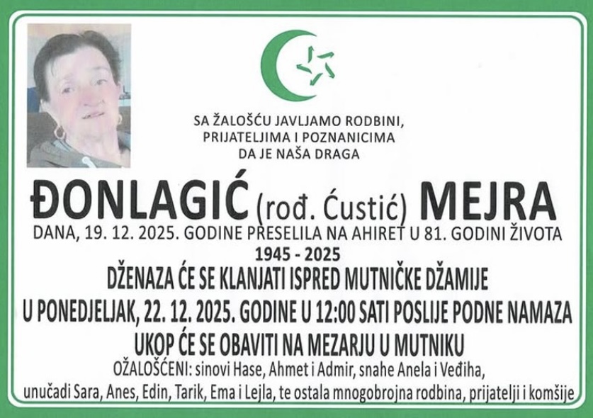 Dženaza će se klanjati ispred Mutničke džamije u ponedjeljak, 22.12.2025. godine u 12:00 sati, poslije podne namaza.