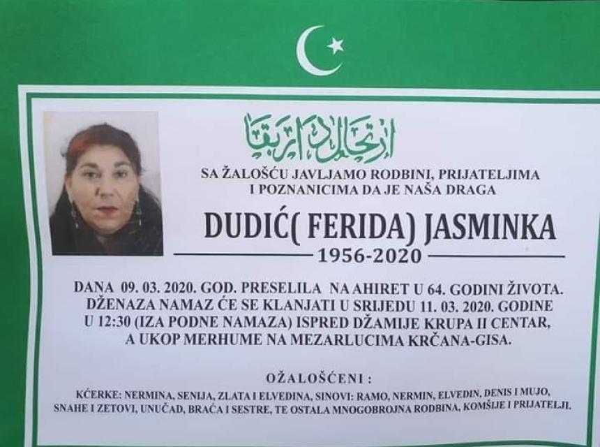 Tužnog srca i s bolom u duši javljamo rodbini, košijama i prijateljima da je naša draga Dudić (Ferida) Jasminka, dana 09.03.2020. godine u 64. godini života preselila na Ahiret.
