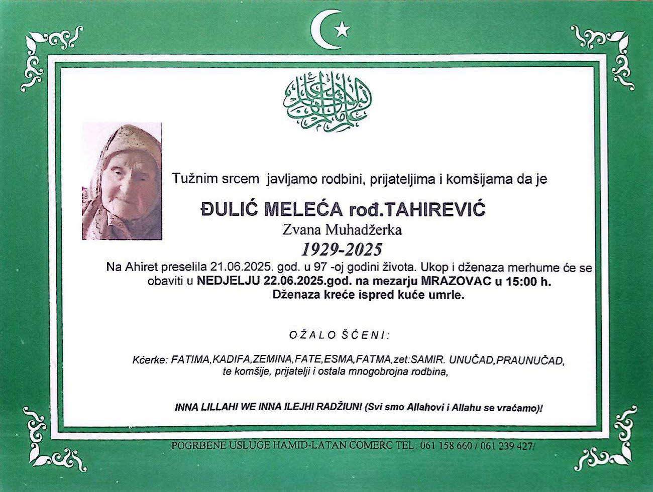 Tužnim srcem javljamo rodbini, prijateljima i poznanicima da je dana 21.06.2025. godine u 97. godini života, na ahiret preselila Đulić (rođ. Tahirević) Meleća.