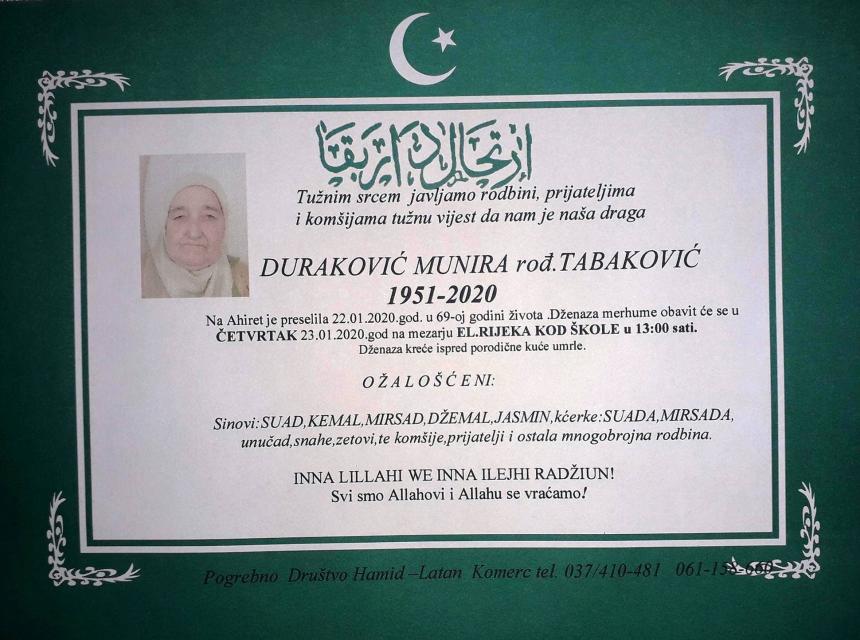 Tužnim srcem i bolom u duši javljamo rodbini i prijateljima da je naša draga Duraković (Tabaković) Munira, u 69. godini života preselila na Ahiret dana 22.01.2020. godine.