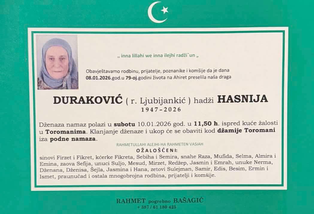 Dženaza namaz polazi u subotu 10.01.2026. god. u 11,50 h ispred kuće žalosti u Toromanima. Klanjanje dženaze i ukop će se obaviti kod džamije Toromani iza podne namaza.
