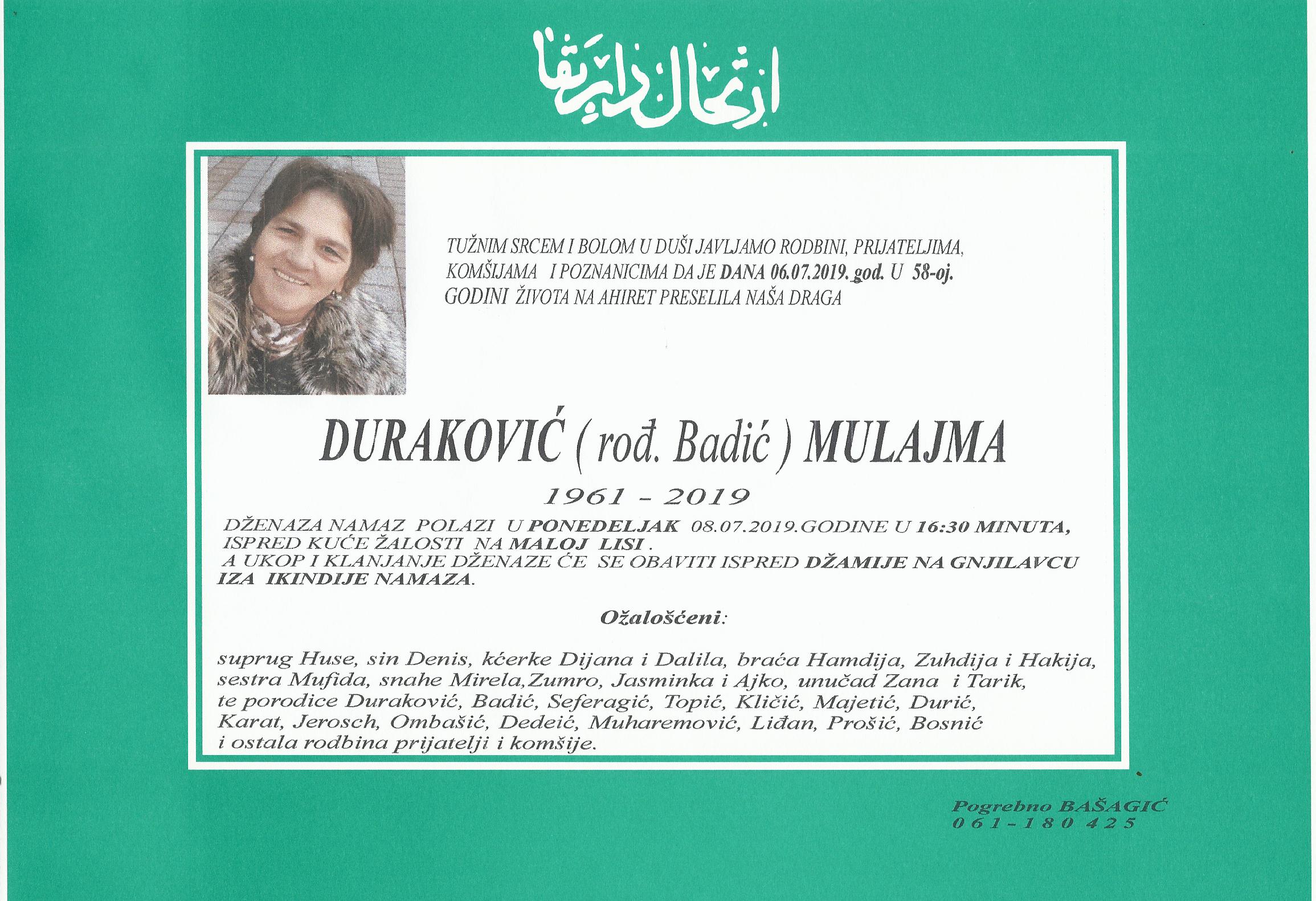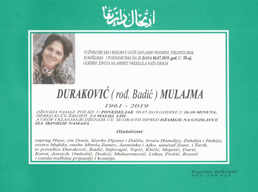 Tužnim srcem javljamo rodbini, prijateljima, komšijama i poznanicima da je dana 06.07.2019.godine u 58. godini života na Ahiret preselila Duraković (rođ. Badić) Mulajma.
