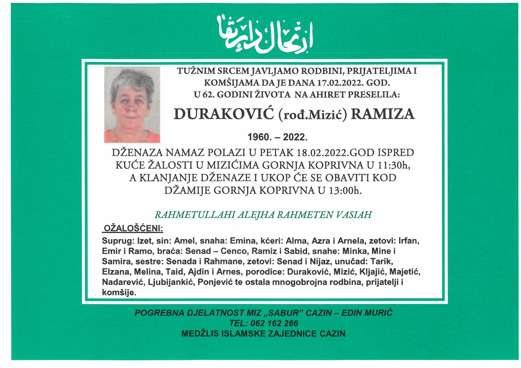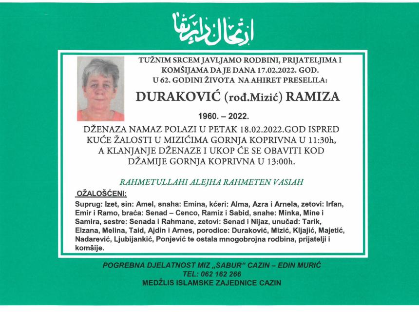 Tužnog srca i s bolom u duši obavještavamo rodbinu, komšije i prijatelje da je naša draga Duraković (rođ. Mizić) Ramiza, dana 17.02.2022. godine, u 62-oj godini života, preselila na Ahiret.