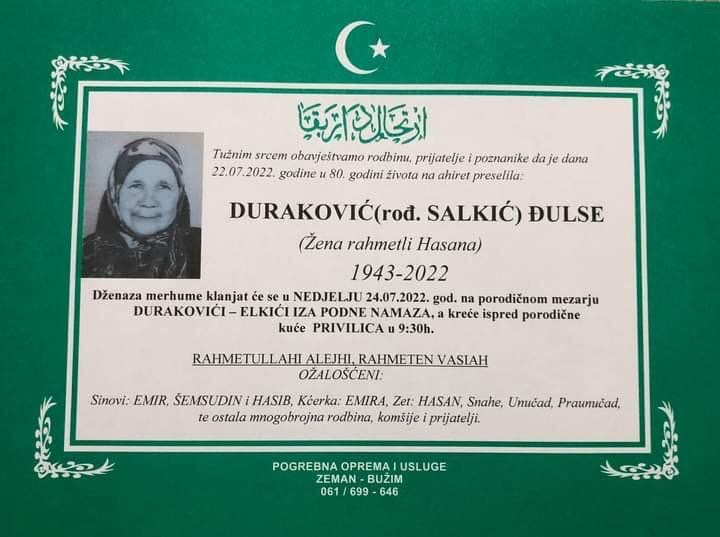 Tužnim srcem i bolom u duši javljamo rodbini, prijateljima i komšijama da je dana 22.07.2022.god. u 80. godini života na Ahiret preselila Duraković (rođ. Salkić) Đulse.