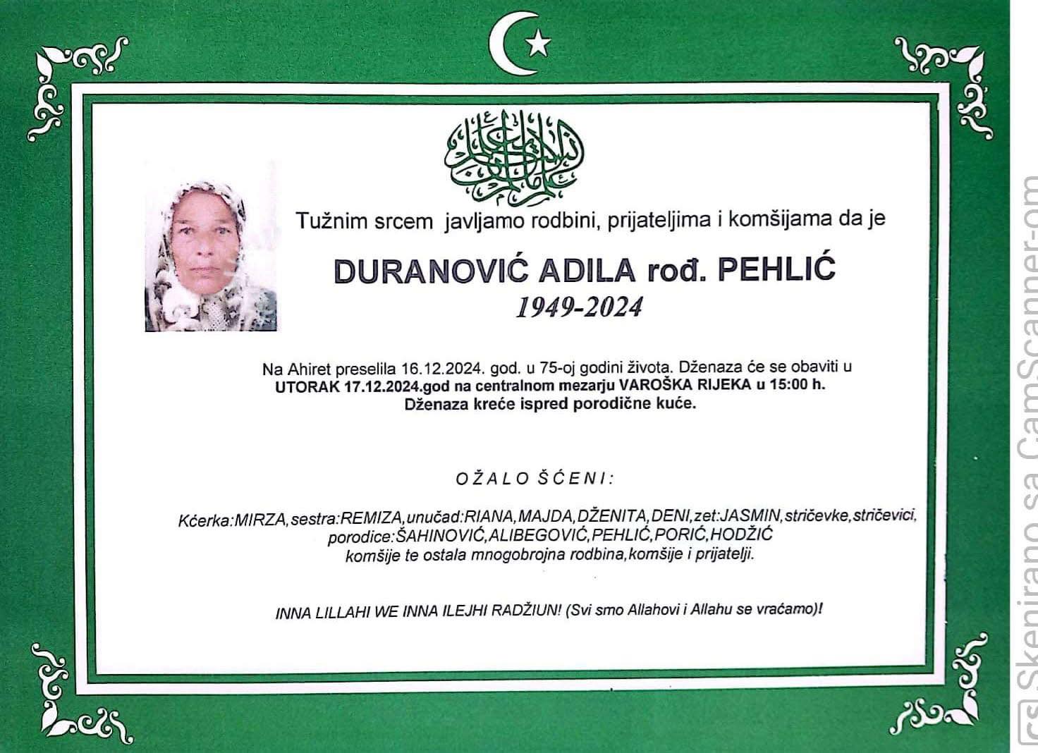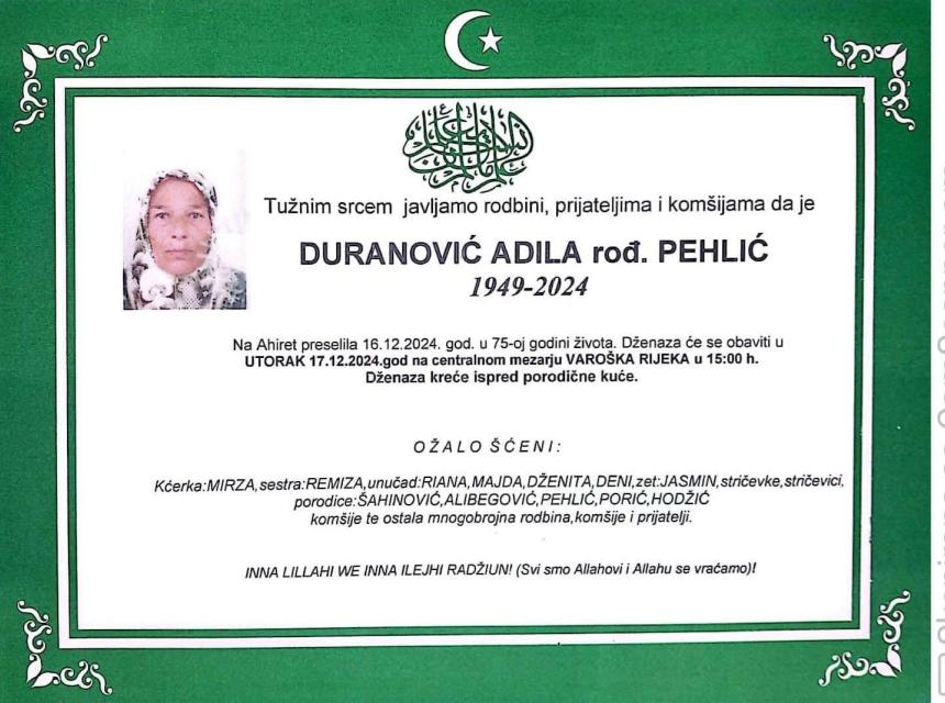 Duboko ožalošćeni obavještavamo rodbinu, prijatelje i komšije da je dana 16.12.2024. god. u 75-oj godini života na ahiret preselila Duranović Adila rođ. Pehlić.