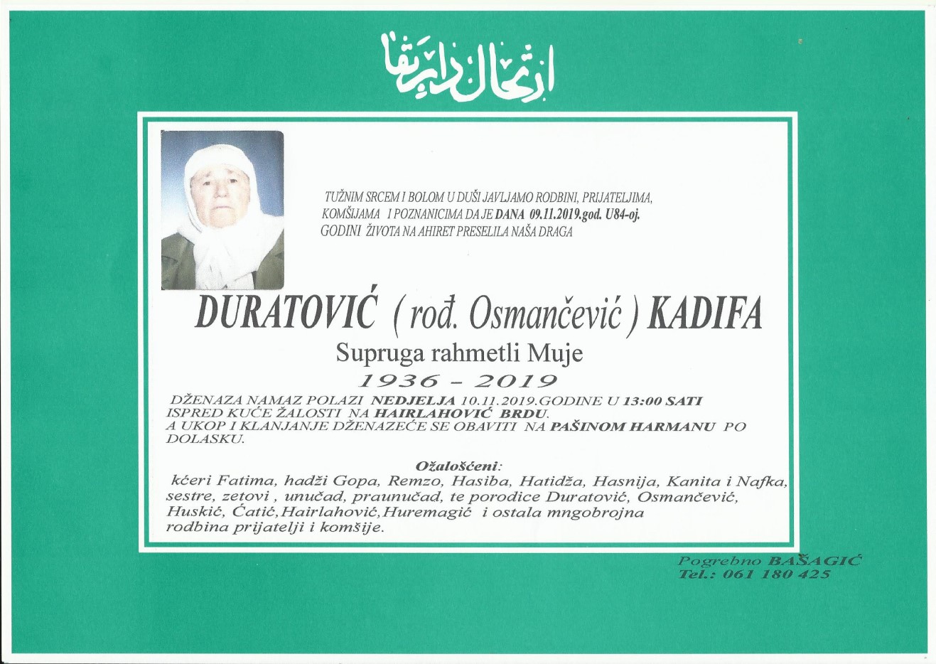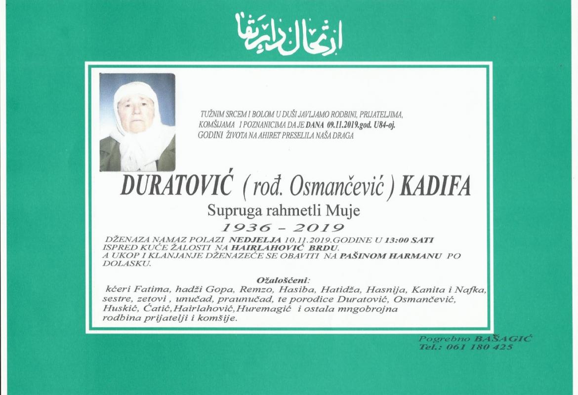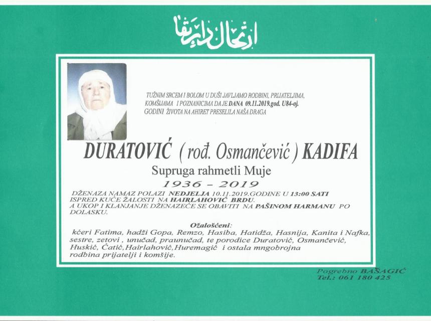 Tužnim srcem i bolom u duši javljamo rodbini, prijateljima, komšijama i poznanicima da je dana 09.11.2019. godine u 84.-oj godini života na Ahiret preselila Duratović (rođ. Osmančević) Kadifa.