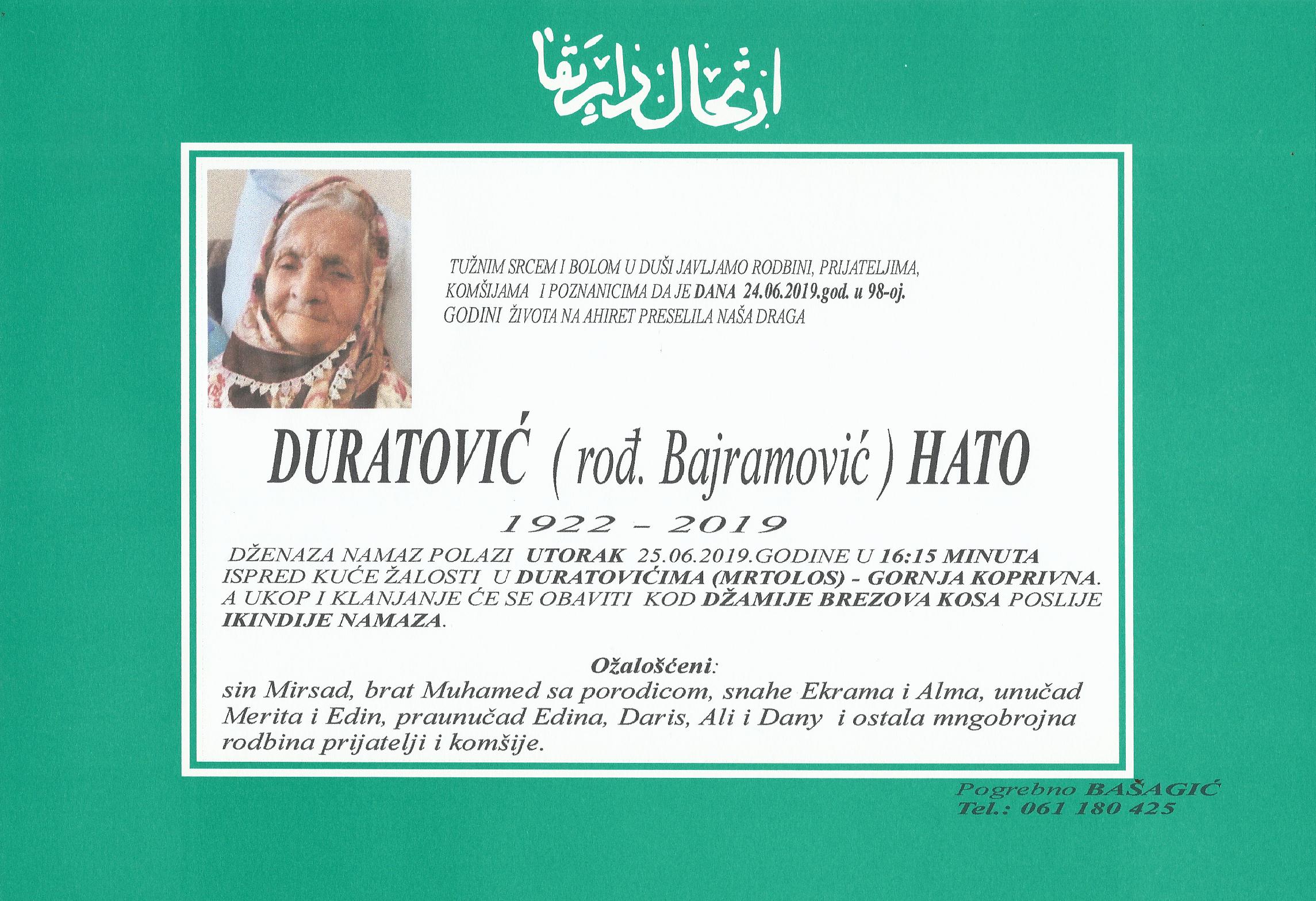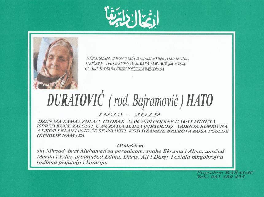 Tužnim srcem javljamo rodbini, prijateljima, komšijama da je dana 24.06.2019. god. u 98-oj godini života na Ahiret preselila Duratović (rođ. Bajramović) Hato.
