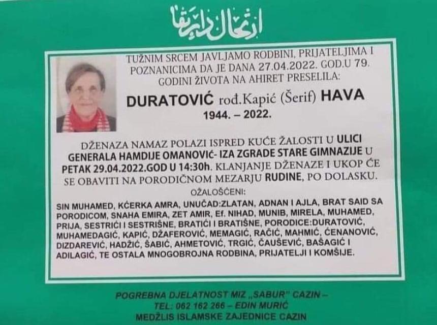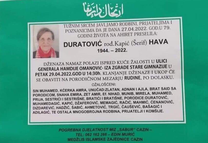 Tužnog srca i s bolom u duši obavještavamo rodbinu, komšije i prijatelje da je naša draga Duratović rođ. Kapić (Šerif) Hava u 79. godini života preselila na Ahiret.