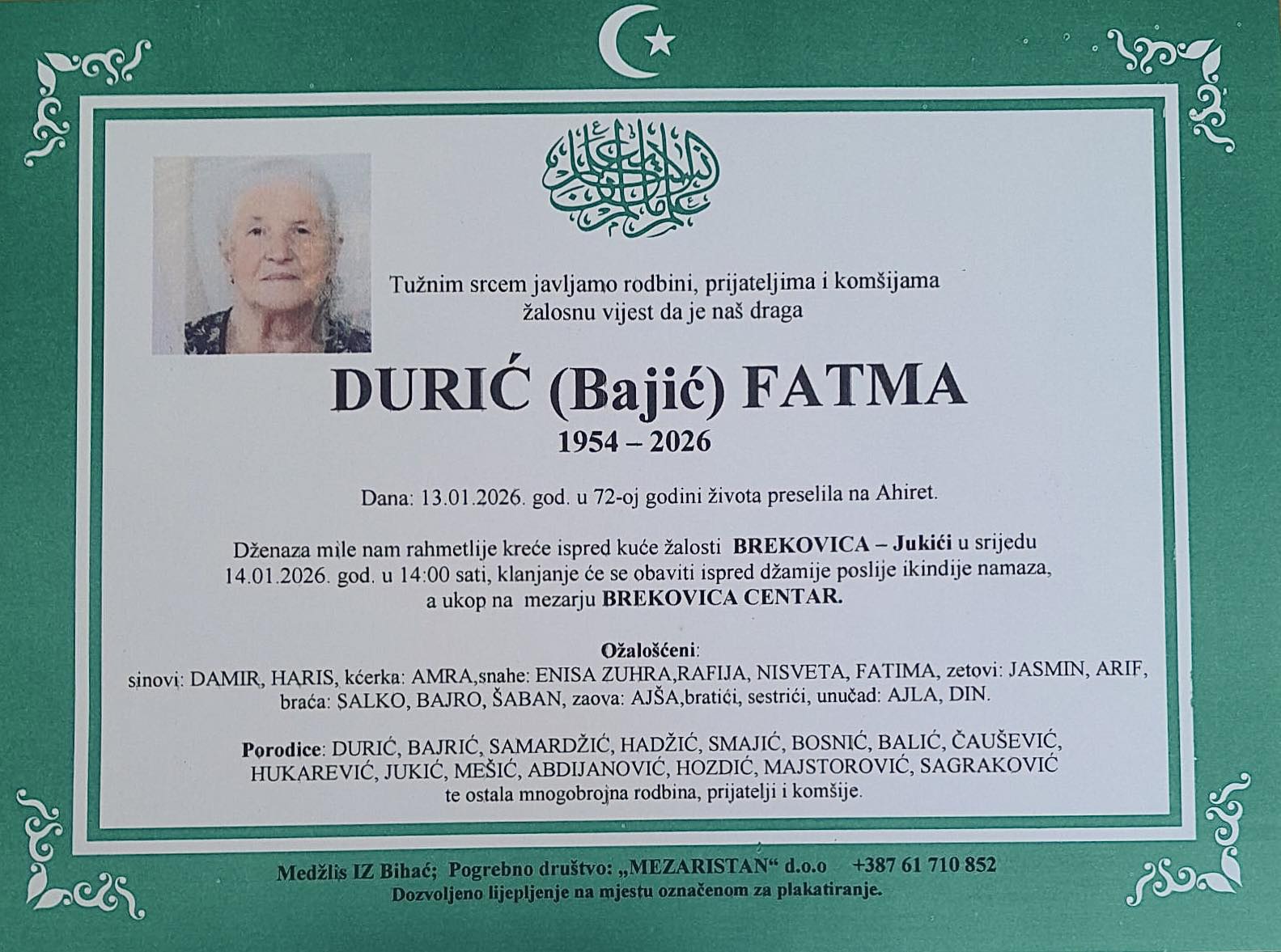 Dženaza mile nam rahmetlije kreće ispred kuće žalosti BREKOVICA – Jukići u srijedu 14.01.2026. god. u 14:00 sati, klanjanje će se obaviti ispred džamije poslije ikindije namaza, a ukop na mezarju BREKOVICA CENTAR.