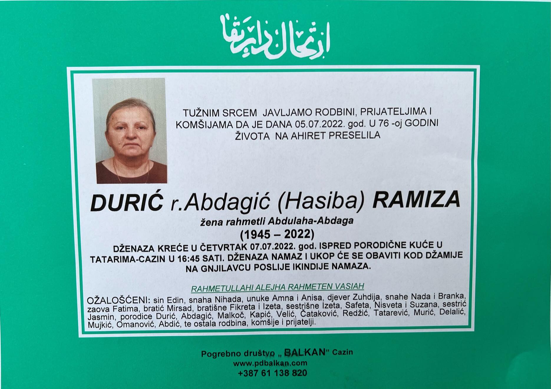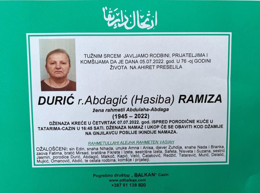 Tužnog srca i s bolom u duši obavještavamo rodbinu, komšije i prijatelje da je naša draga Durić r. Abdagić (Hasiba) Ramiza u 76. godini života preselila na Ahiret.