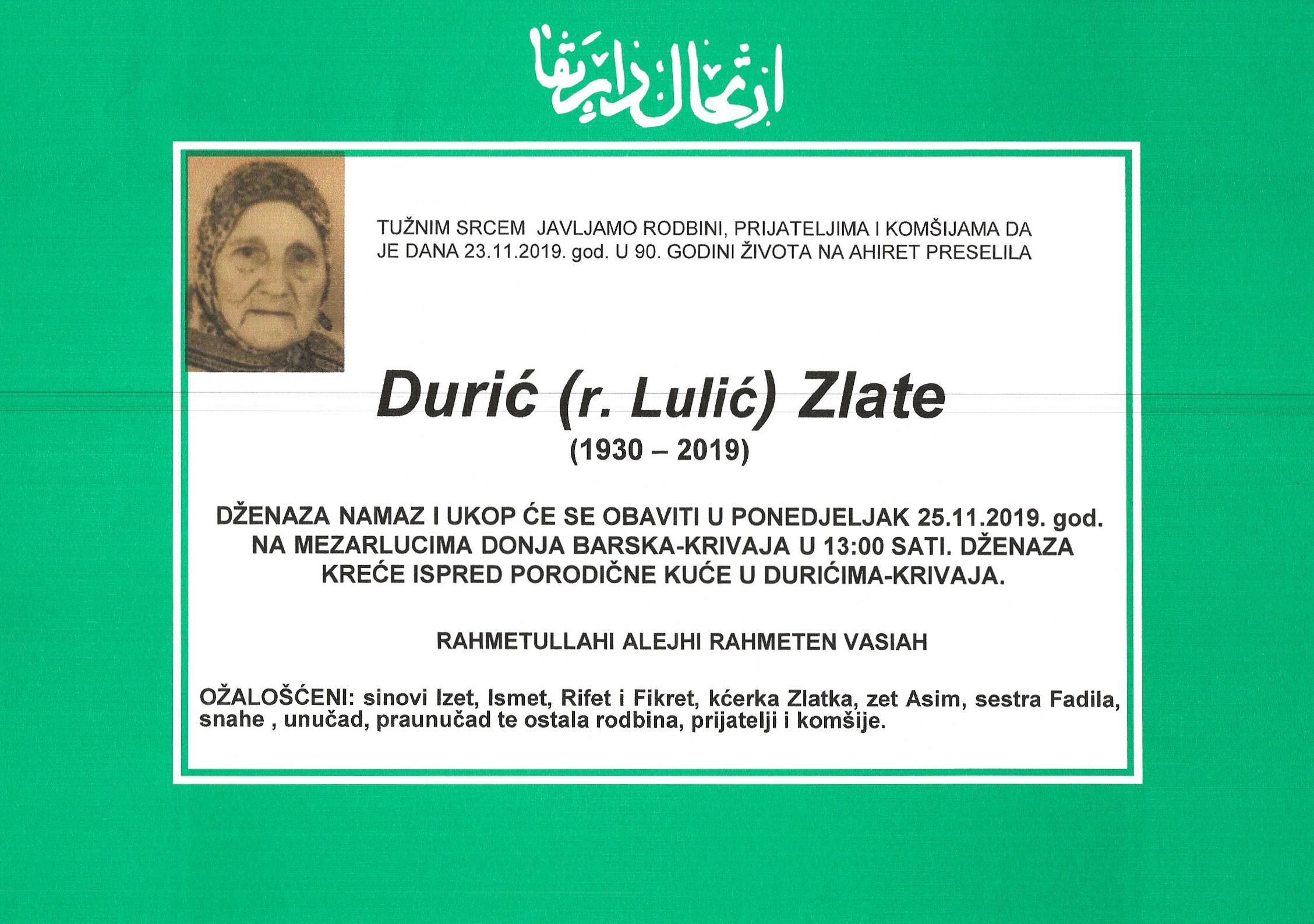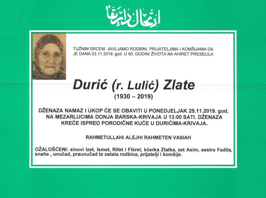 Tužnim srcem i bolom u duši javljamo rodbini, prijateljima, komšijama i poznanicima da je dana 23.11.2019. godine u 90-oj godini života na Ahiret preselila naša draga Durić (r. Lulić) Zlate.