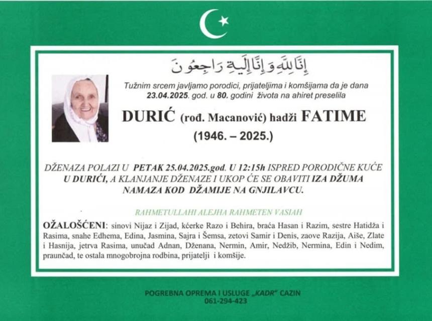 Dženaza polazi u petak 25.04.2025. godine u 12:15 sati porodične kuće u Durići , a klanjanje dženaze i ukop će se obaviti iza džuma namaza kod džamije na Gnjilavcu.