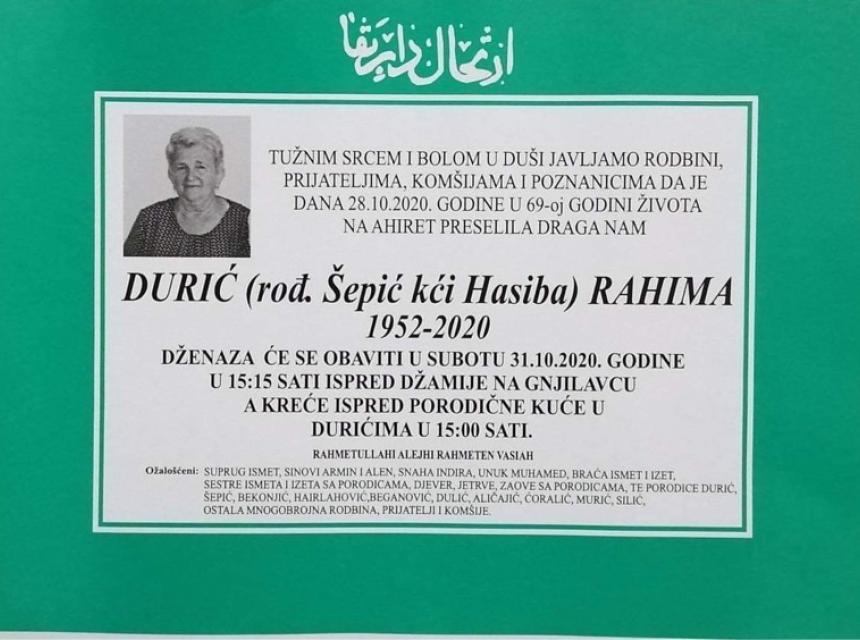 Tužnog srca i s bolom u duši obavještavamo rodbinu, komšije i prijatelje da je naša draga Durić (rođ. Šepić kući Hasiba) Rahima, dana 28.10.2020. godine, u 69-oj. godini života, preselila na Ahiret.