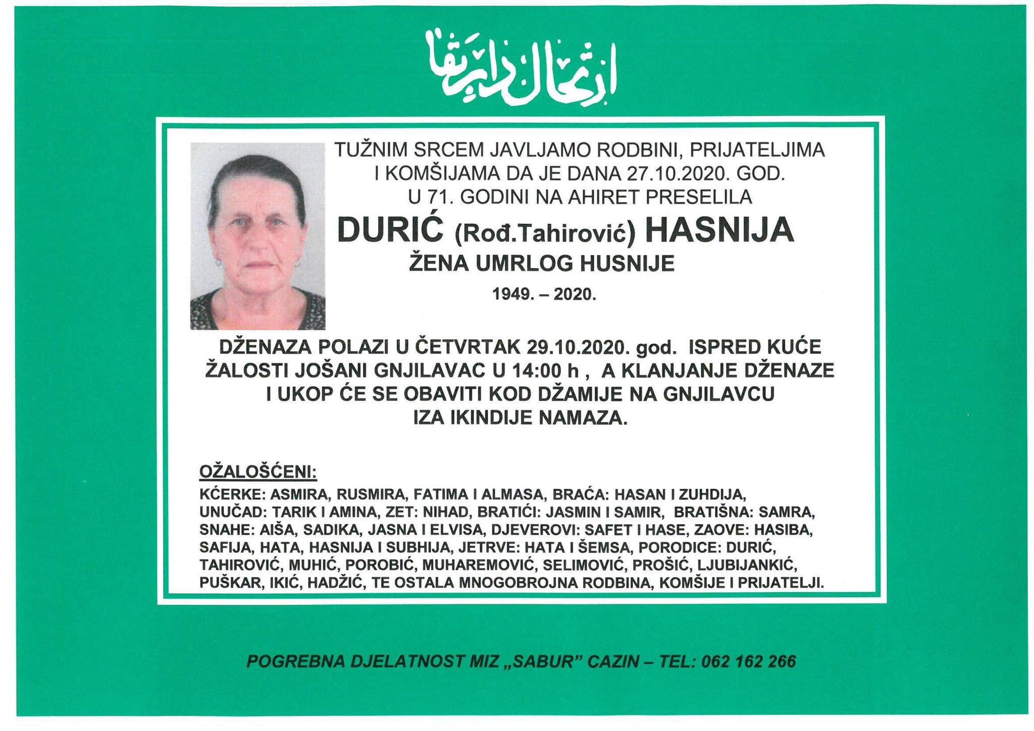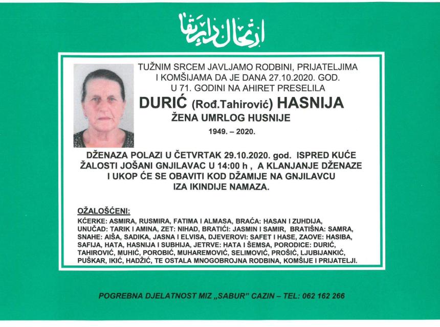 Tužnog srca i s bolom u duši obavještavamo rodbinu, komšije i prijatelje da je naša draga Durić (rođ. Tahirović) Hasnija 27. oktobra 2020. godine, u 71. godini života, preselila na Ahiret.