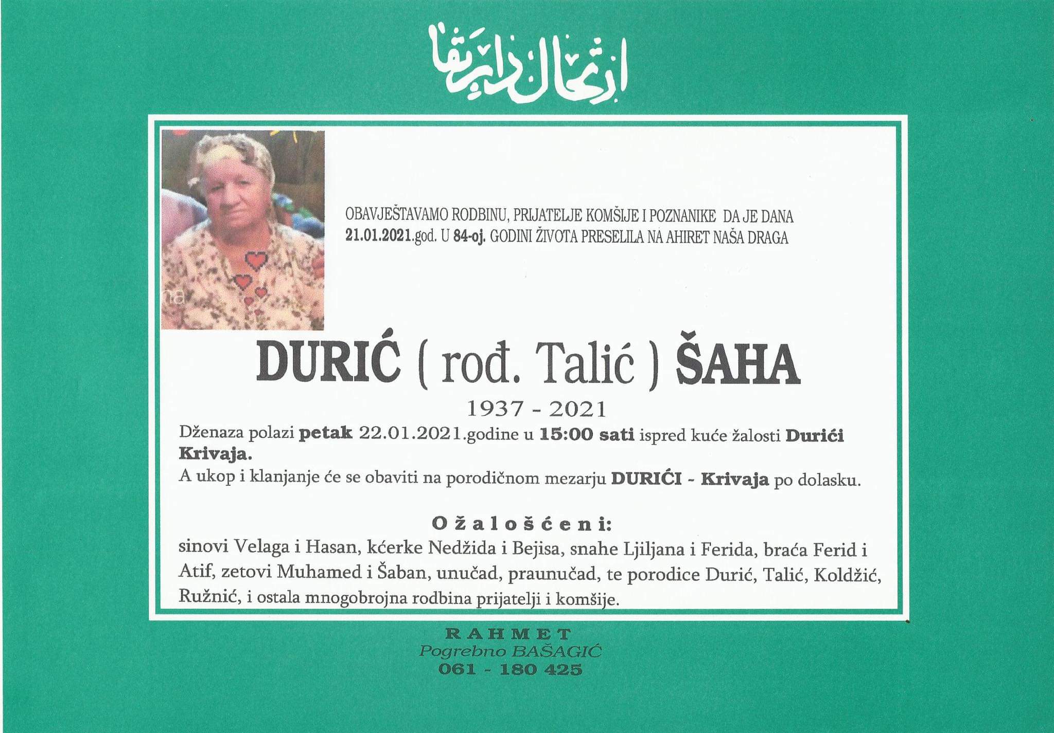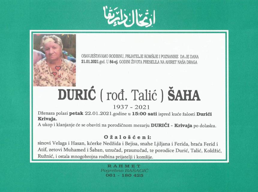 Tužnog srca i s bolom u duši obavještavamo rodbinu, komšije i prijatelje da je naša draga Durić (rođ. Talić) Šaha, dana 21.01.2021. godine, u 84. godini života, preselila na Ahiret.