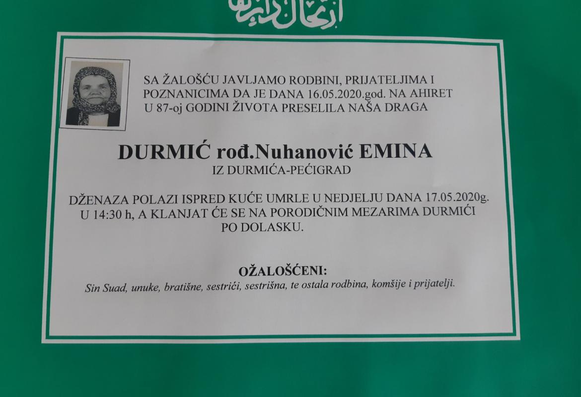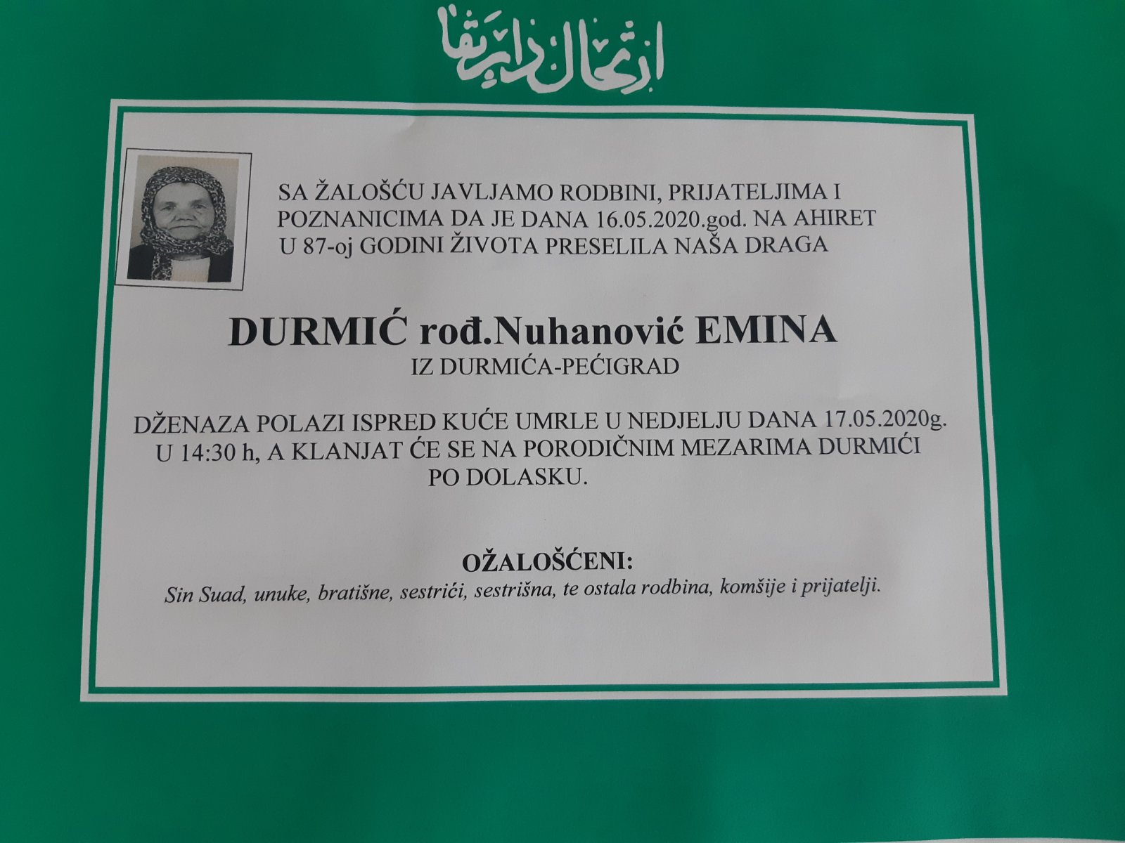 Tužnim srcem i bolom u duši javljamo rodbini i prijateljima da je naša draga i nikad prežaljena Durmić (Nuhanović) Emina dana 16.05.2020. godine u 87-oj godini života preselila na Ahiret.