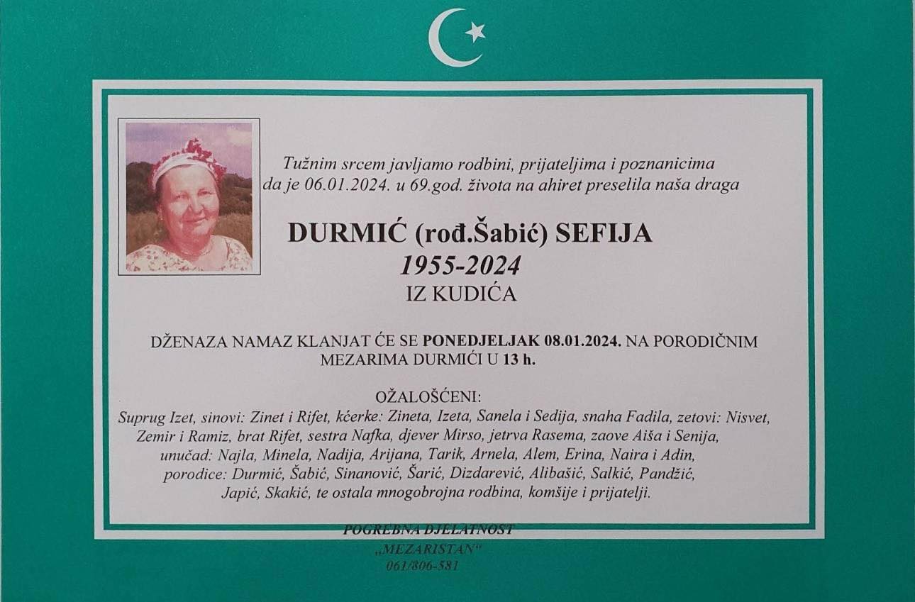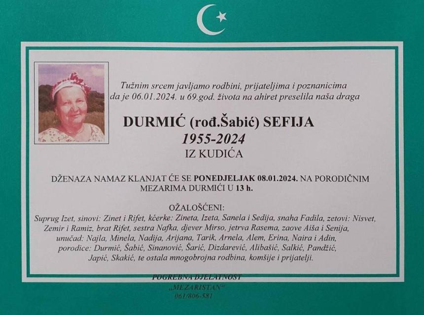 Tuznog srca obavjestavamo rodbinu, prijatelje i komsije da je nasa draga Durmić (rođ. Šabić) Sefija preselila na ahiret dana 06.01.2024. godine, u 69. godini zivota.