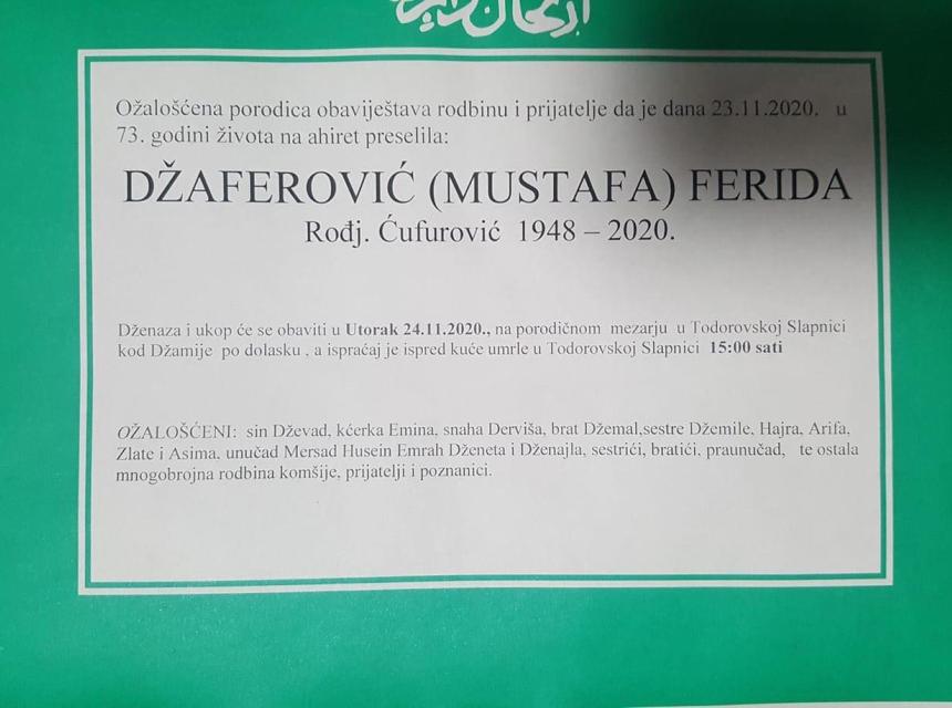 Dženaza i ukop će se obaviti u utorak 24.11.2020. godine, na porodičnom mezarju u Todorovskoj Slapnici kod džamije po dolasku, a ispraćaj je ispred kuće umrle u Todorovskoj Slapnici u 15:00h.