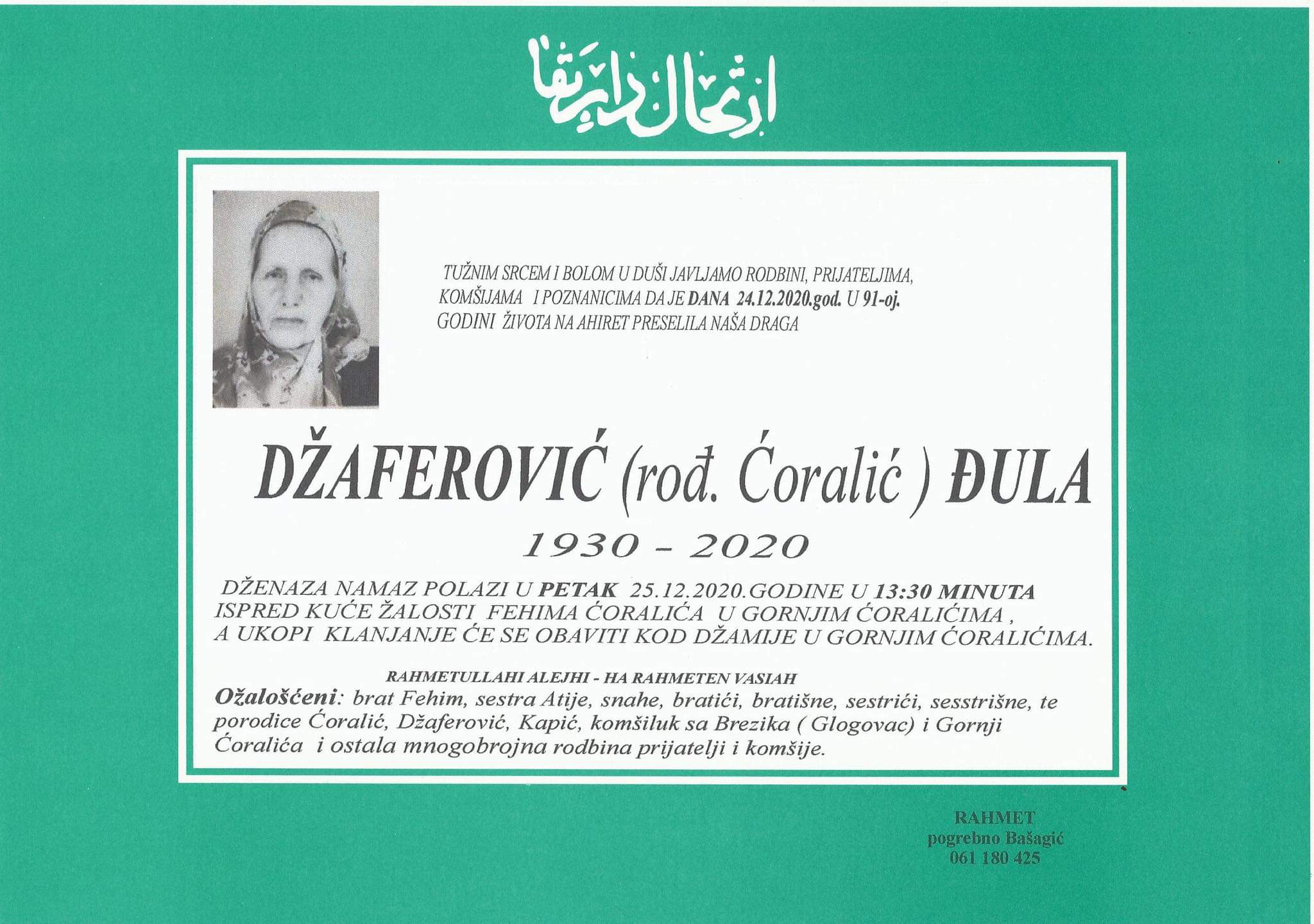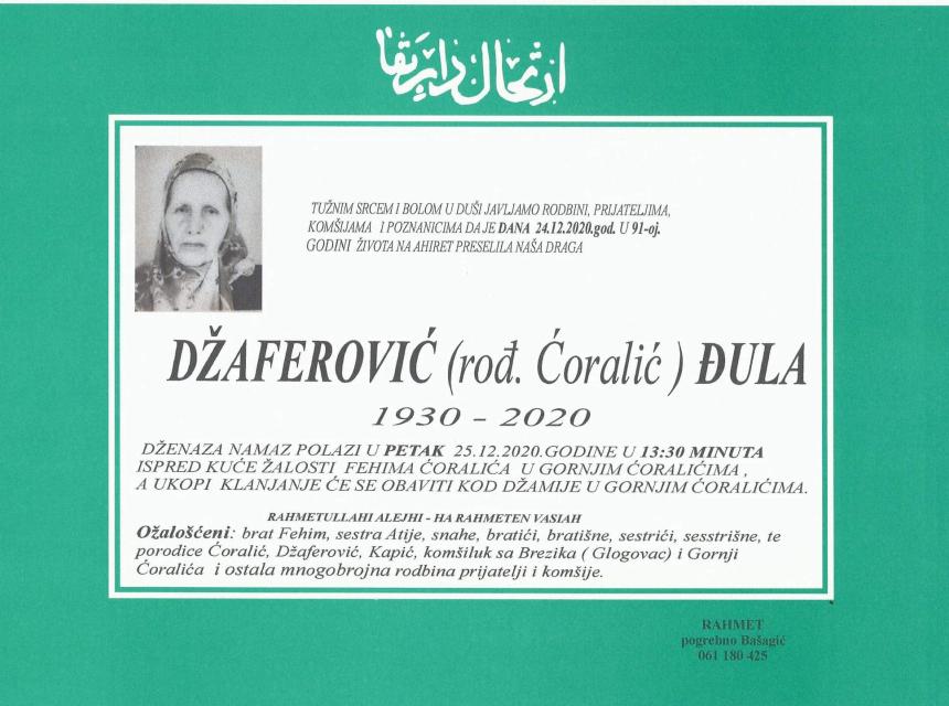 Tužnog srca i s bolom u duši obavještavamo rodbinu, komšije i prijatelje da je naša draga Džaferović (rođ. Ćoralić) Đula preselila na Ahiret, dana 24. decembra 2020. godine u 91. godini života.