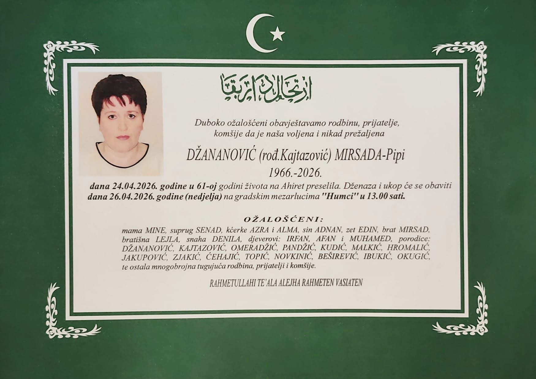 Dženaza i ukop će se obaviti dana 26.04.2026. godine (nedjelja) na gradskim mezarlucima “Humci” u 13.00 sati.