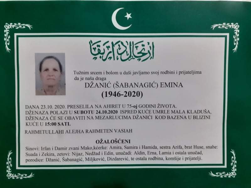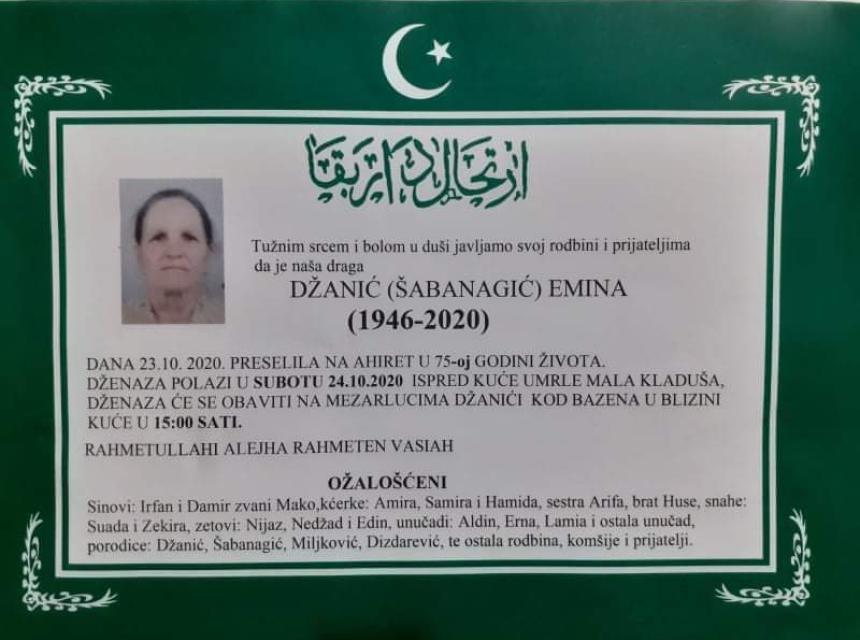 Tužnog srca i s bolom u duši obavještavamo rodbinu, komšije i prijatelje da je naša draga Džanić (Šabanagić) Emina 23. oktobra 2020. godine, u 75. godini života, preselila na Ahiret.