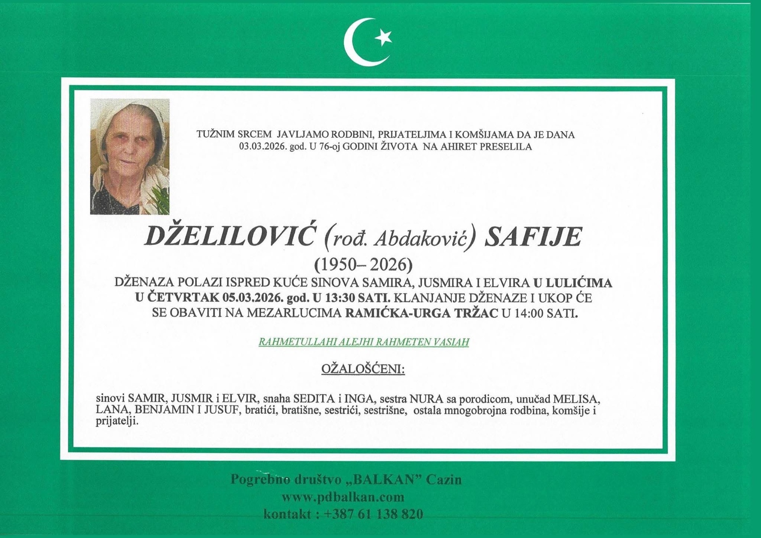 Tužnim srcem javljamo rodbini, prijateljima i komšijama da je dana 03.03.2026. godine u 76. godini života na Ahiret preselila