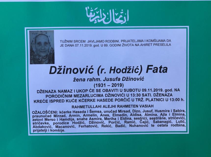 Dženaza polazi ispred će se obaviti u srijedu dana 09.11.2019.g. u 13:30 minuta na porodičnim mezarlucima Džinovići. Dženaza kreće ispred kuće kćerke Hasede Porčić u Trž. Platnici u 13 h.