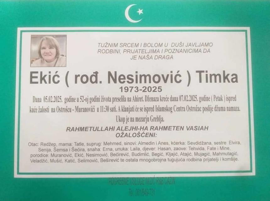 Duboko ožalošćeni obavještavamo rodbinu, prijatelje i komšije da je dana 05.02.2025. god. u 52. godini života na ahiret preselila Ekić (rođ. Nesimović) Timka.