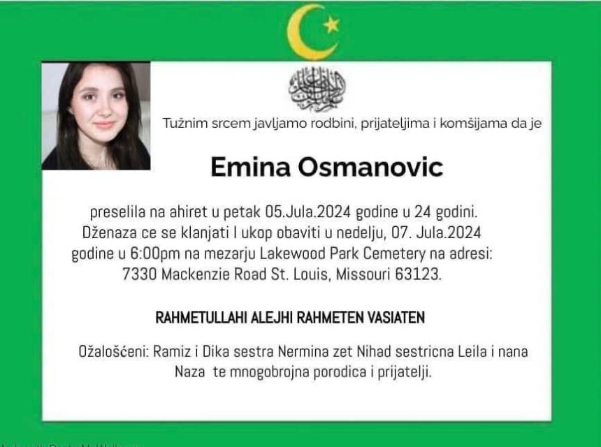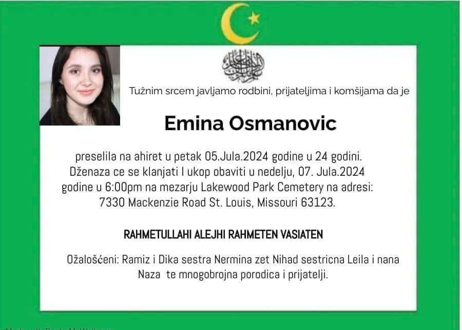 Tužnim srcem i bolom u duši javljamo rodbini, prijateljima i komšijama da je naša draga Emina Osmanovic , dana 05.07.2024. godine u 24-oj godini života, preselila na Ahiret.
