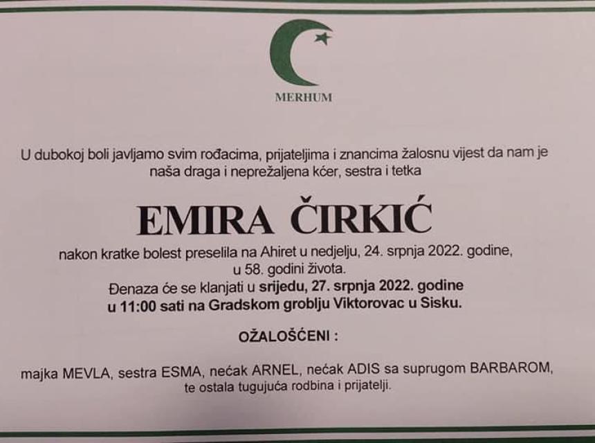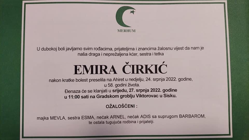 Dženaza namaz i ukop će se obaviti dana 27.07.2022. god. u 11:00h na gradskom groblju Viktorovac u Sisku.